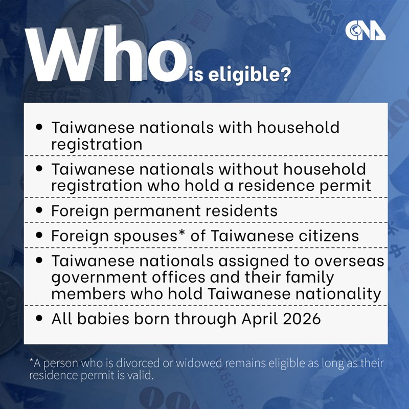 Additionally, non-registered nationals with residence permits, foreign permanent residents, and foreign spouses of Taiwanese citizens with residence permits also qualify for the handouts.