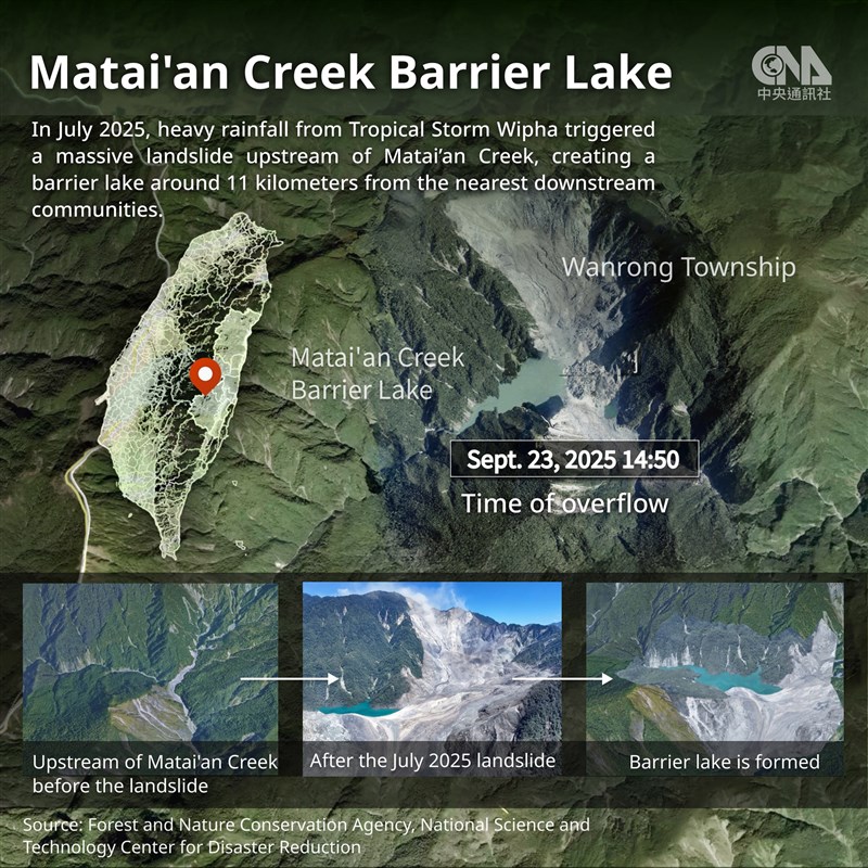 Taipei, Oct. 1 (CNA) The main cause of the Matai'an Creek barrier lake overflow was several mountain slope collapses, the largest of which was 403 meters, the Forestry and Nature Conservation Agency said Wednesday.