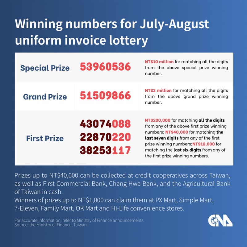 The winning number for the NT$10 million Special Prize is 53960536, while the NT$2 million Grand Prize number is 51509866, according to the Taxation Administration.