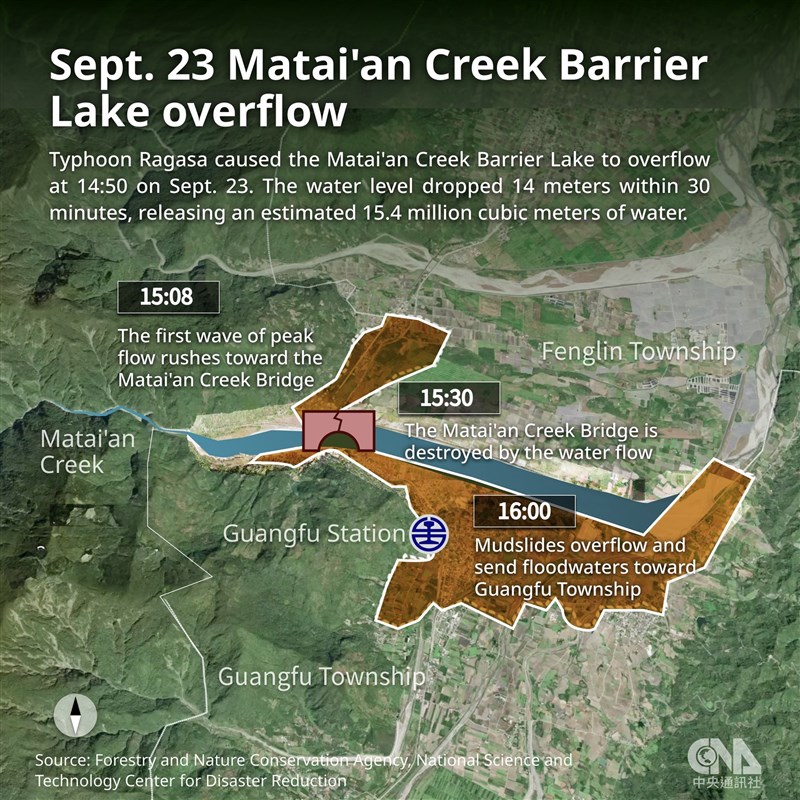 On Sept. 23, a historic downpour caused the Matai'an Barrier Lake in Hualien to burst its banks, sending 60 million tons of water and debris through Guangfu Township and killing at least 19 people.