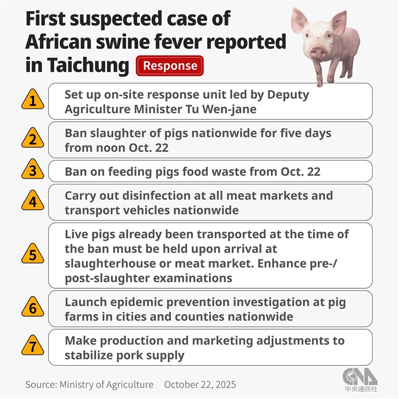 Taipei, Oct. 22 (CNA) Taiwan on Wednesday reported its first suspected domestic outbreak of African swine fever, becoming the latest country affected by the deadly pig disease that has hit 68 countries and territories since 2022.