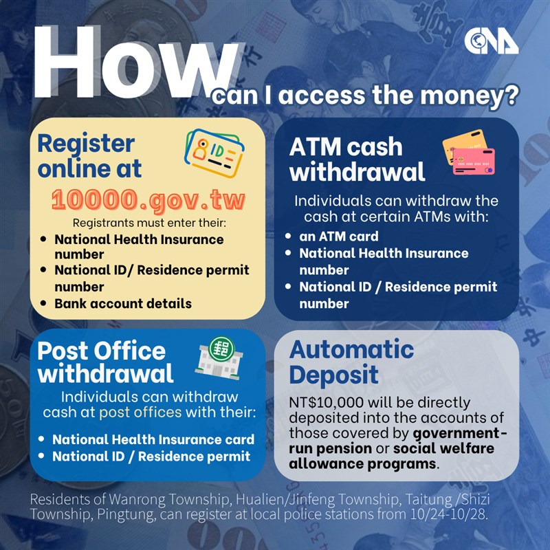 The Ministry of Finance (MOF) said that people who successfully completed registration or qualified for direct deposit and passed system verification would have the NT$10,000 payment transferred to their accounts on Wednesday.