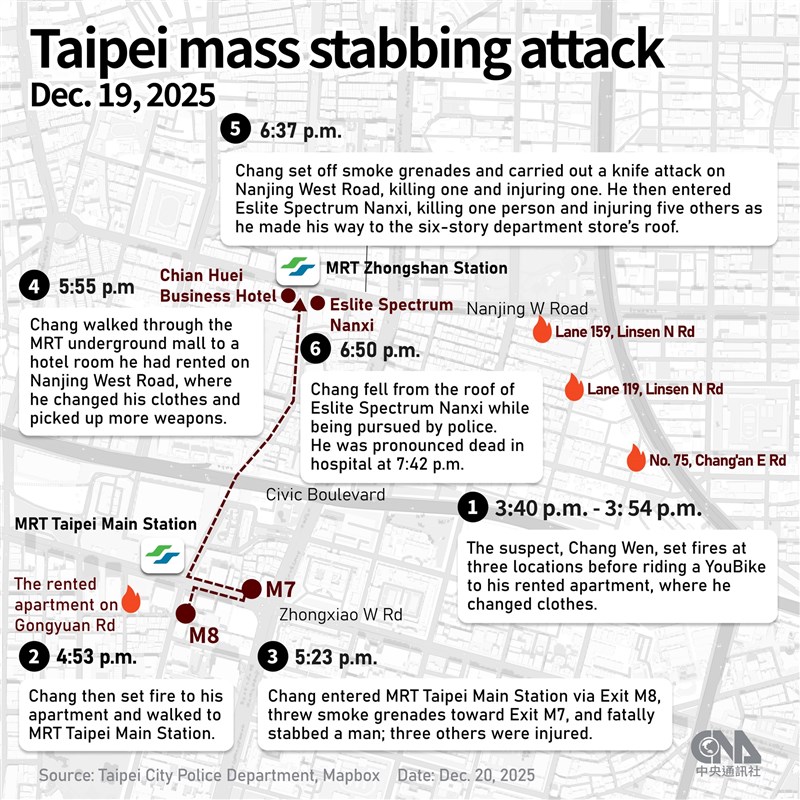 During the attack on Friday, a 27-year-old man, later identified as Chang Wen (張文), tossed smoke grenades in Taipei Main Station and went on a stabbing spree in that area and the nearby Zhongshan shopping district, leaving three people dead and several others injured, according to police.