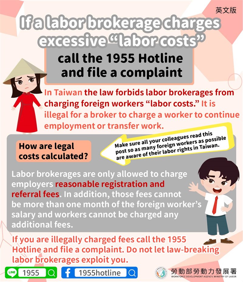 Urging brokers to comply with the law, Su also said migrant workers who are asked to pay job-placement fees when seeking to switch employers should call the ministry's 1955 Hotline for advice or to file a complaint.